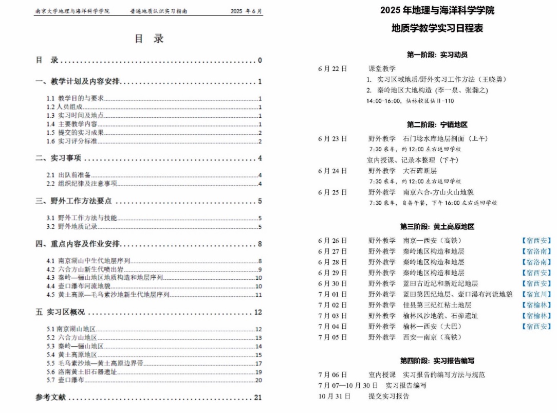 为构建更加契合新时代需求的地质学实习路线,团队参考鹿化煜教授等人编写的《秦岭—毛乌素地区实习手册》和董云鹏教授主讲的《秦岭造山带—鄂尔多斯盆地野外实践》课程,广泛查阅最新文献,对现有《简明地质学实习指南》进行了系统修订(图3。同时,团队根据不同区域的地质特征、地形与交通状况,充分考虑美女做爱 本科生的知识结构和学习特点,重新构建了美女做爱 大纲,设计了合理的观察点和讲解内容。