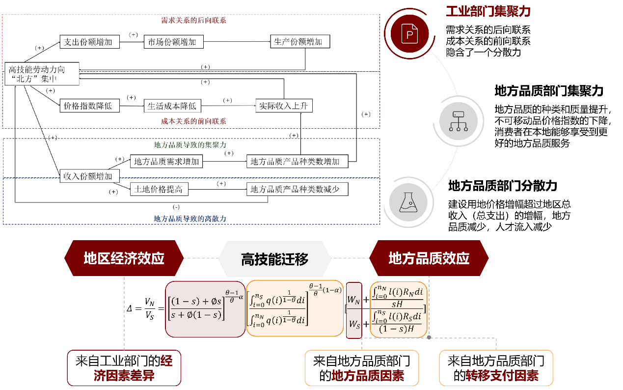 人才是第一资源,在国家建设中占有突出战略地位,高技能劳动力是人才队伍中的重要组成部分,是建设创新型国家和提升国家核心竞争力的重要推动力。当前,中国人口发展面临少子化、老龄化、区域人口增减分化的新趋势,亟需认识和把握我国现阶段高技能劳动力迁移的特点和规律。古恒宇助理教授团队长期从事人口地理学研究,近年来聚焦人才地理与区域发展相关研究领域,围绕人才地理分布和流动迁移的格局、过程、机制和效应开展了系统性研究。《中国高技能劳动力迁移研究》批判继承新经济地理学的空间一般均衡理论,突破了传统单维度经济驱动理论局限,创新性地构建了“两区域、两劳动力、三部门”的空间均衡理论模型,论述了地方品质因素对当代中国人才集聚和区域发展的影响(图1)。其次,他们拓展了空间计量模型和方法,针对传统引力模型的零膨胀与网络自相关问题,开发了空间滤波两阶段复合引力模型,从宏观和微观两个视角揭示了中国21世纪高技能劳动力迁移的规律和机理。最后,他们构建了“政府-市场-社会”协同治理框架,提出了一系列促进人才合理流动的政策措施,为推动人才区域协调发展提供了针对性建议。本书的核心观点和方法被多篇高水平论文借鉴和讨论,并在应用经济学、公共管理学、人文地理学等学科领域产生了积极影响。