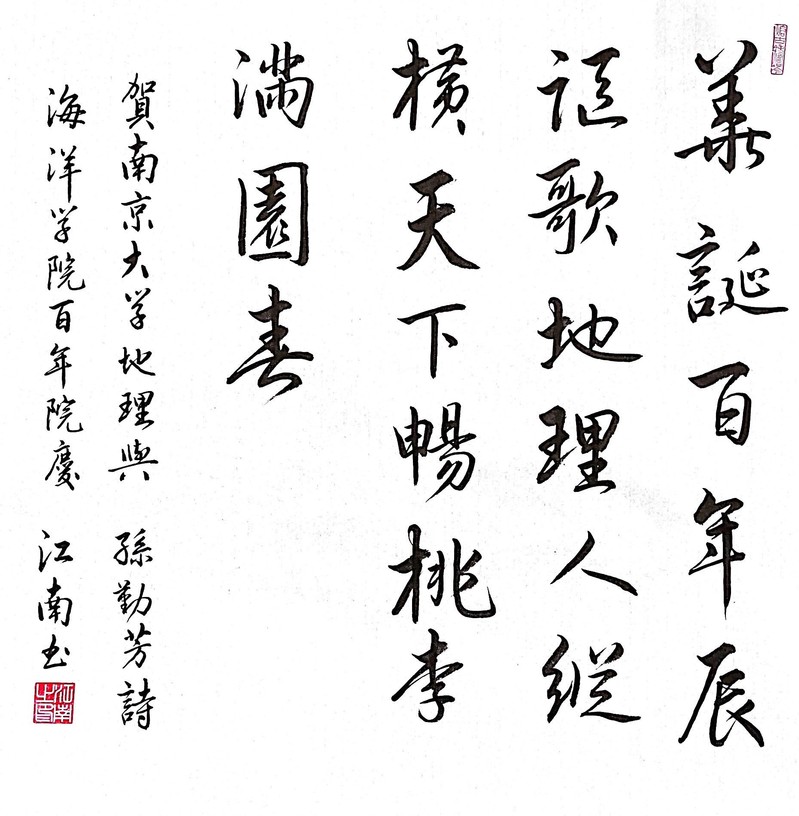 贺百年院庆:华诞百年辰,讴歌地理人,纵横天下畅,桃李满园春(孙勤芳教授诗,江南教授书,2022)